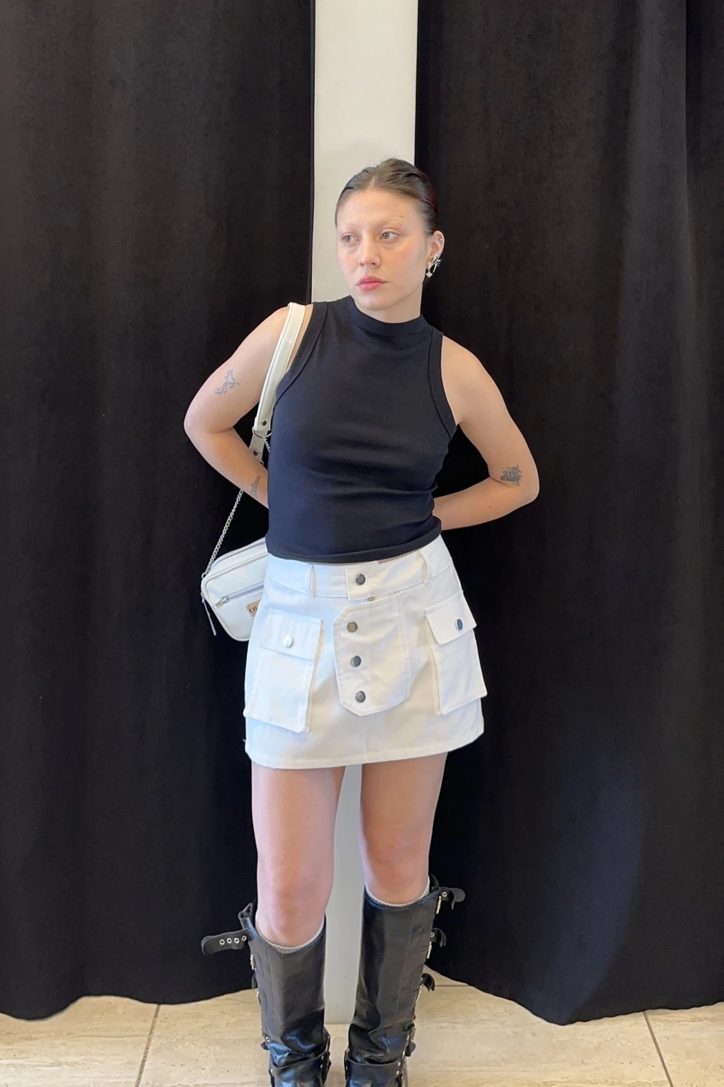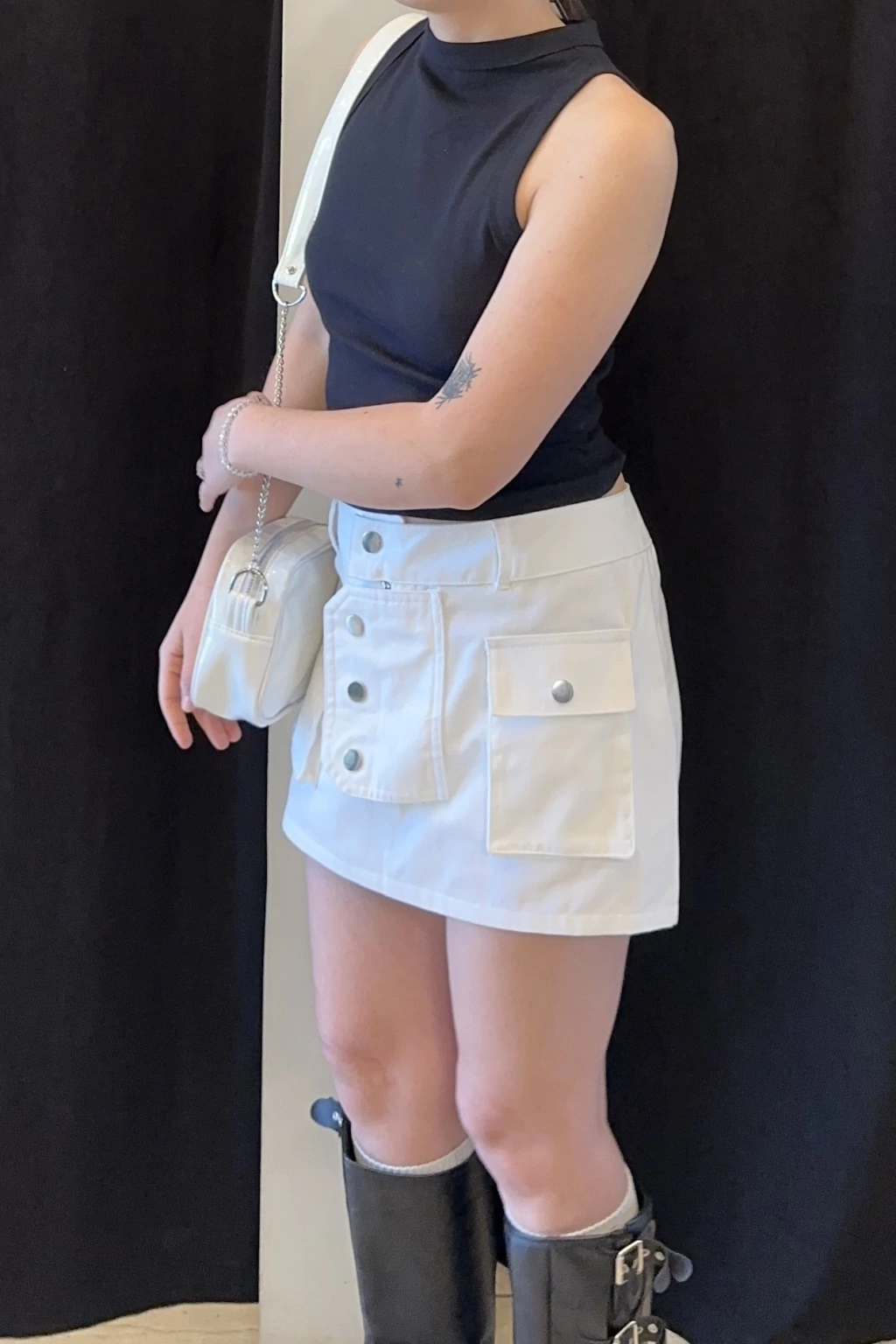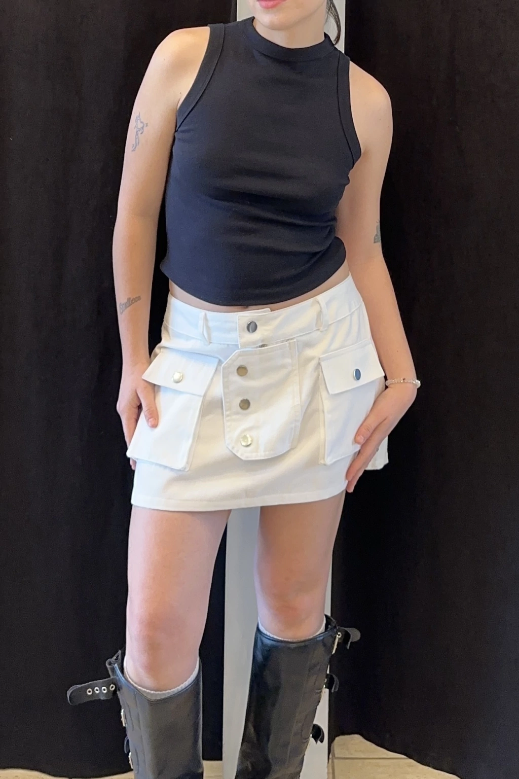 Esta mini de gabardina combina estilo urbano y funcionalidad con un diseño cuidado. Cuenta con cintura con presillas para cinturón y cartera con cierre y botón, junto a una tapa de cierre con botones snap metálicos a la vista que le aportan un detalle moderno y distintivo. Los prácticos bolsillos cargo delanteros suman utilidad sin perder la línea estilizada de la prenda.