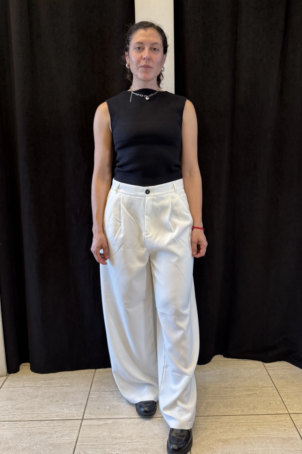Este pantalón sastrero presenta tablas en el delantero, tiene bolsillos laterales funcionales y un sutil detalle en forma de "V" en la cintura trasera que realza el calce. De corte recto y estructura liviana, es ideal para looks formales o más relajados según cómo lo combines.