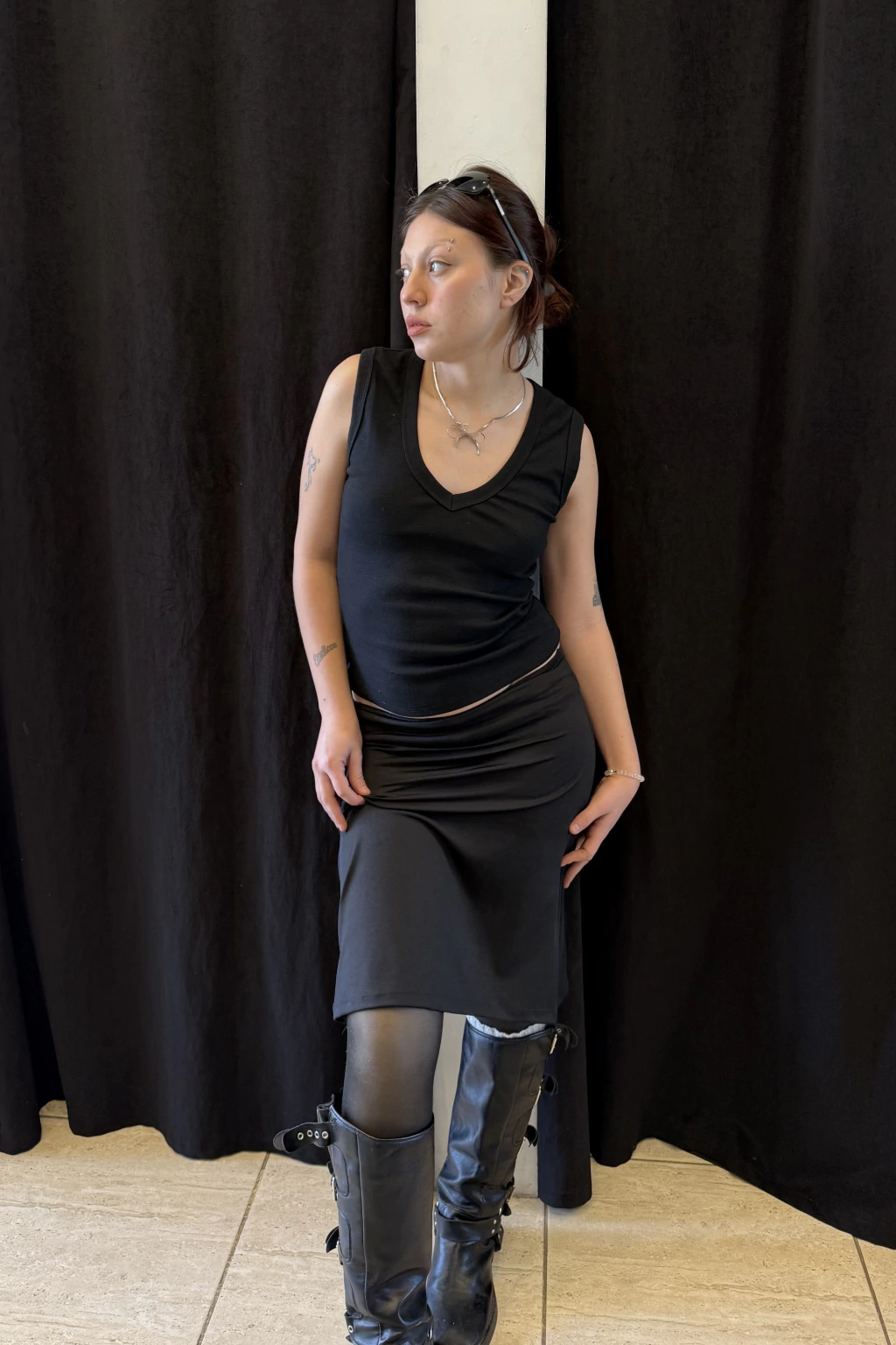 Esta pollera llega justo por las rodillas y está confeccionada en microfibra con lycra. Su diseño cuenta con collareta en la cintura para un ajuste perfecto y versátil. Podés usarla tanto tiro bajo como tiro alto, adaptándose a tu estilo y preferencia. Ideal para usar con camisas over, abotonada o desabotonada con un top a juego.