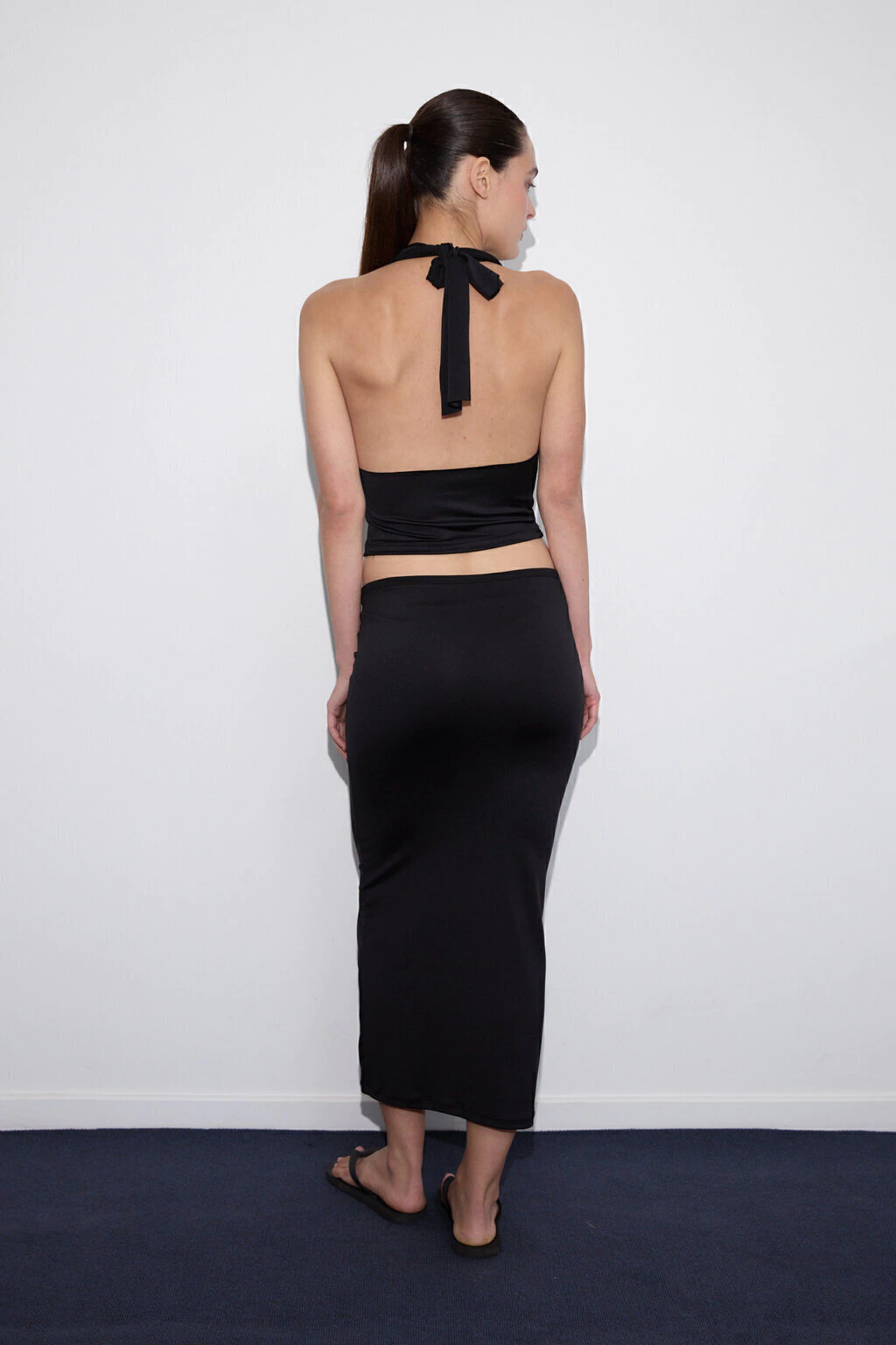 Queda increíble con tops al cuerpo, remeras básicas, camisas amplias, musculosas rectas o sueltas por dentro. Si buscás un look más de noche, combinala con el top halter como en las fotos: clásico, limpio y súper sentador.
